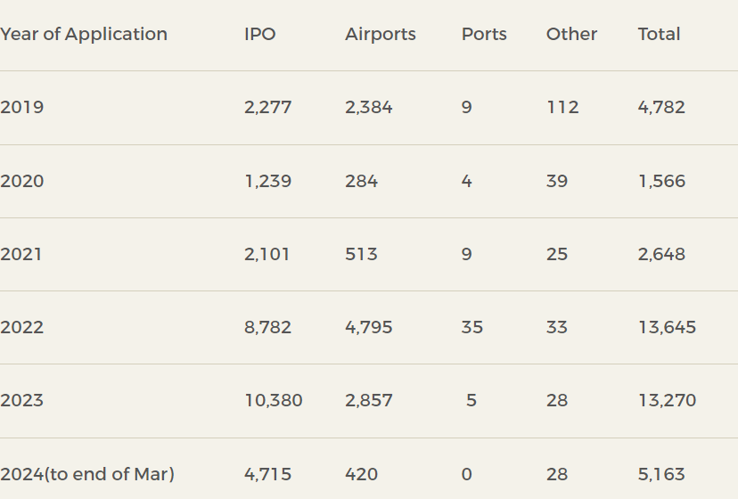 The total number of applications in 2022 and 2023 is much higher than in preceding years (2024 is on a similar track) but the percentage of initial applications that take place at the IPO for those years (65.2% and 78.2%) are within a similar range to the preceding five years.