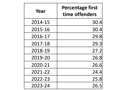 The report also outlines the percentage of all crimes that were first-time offences in each year between 2014-15 and 2023-24.