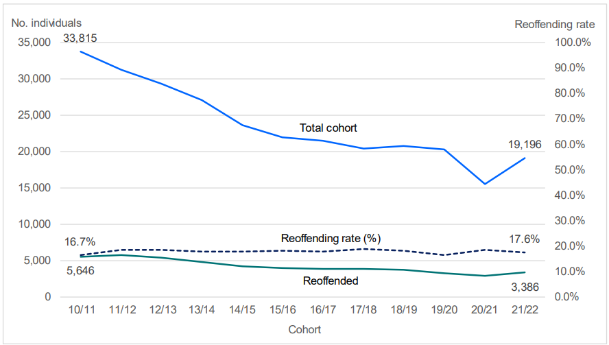 The 17.9% figure for 2021-22 represented a 1.2 percentage point decrease on 2020-21 (note that both these years were during the COVID-19 pandemic, which may have had some impact). Between 2010-11 and the most recent year, the reoffending rate fluctuated between 16.5% and 19.0%.