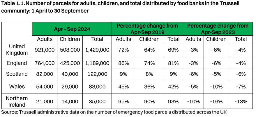 “Food banks in the Trussell community in Northern Ireland distributed almost 35,000 emergency food parcels between 1 April to 30 September 2024. This is a 13% decrease compared to the same period in 2023 when close to 40,000 parcels were distributed. However, levels of need remain significantly higher than just five years ago.