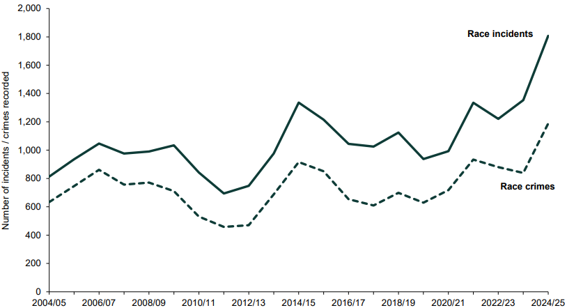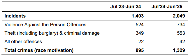- Four of the five highest monthly levels of race incidents in the data series were recorded between July 2024 and June 2025. The 349 race incidents recorded in August 2024 was the single highest monthly level in the data series, followed by the 345 race incidents recorded in June 2025.