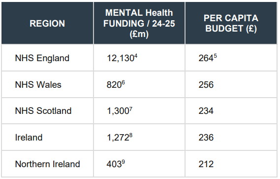 - Mental health receives around 7% of the health budget, the lowest proportion across the UK and Ireland.
