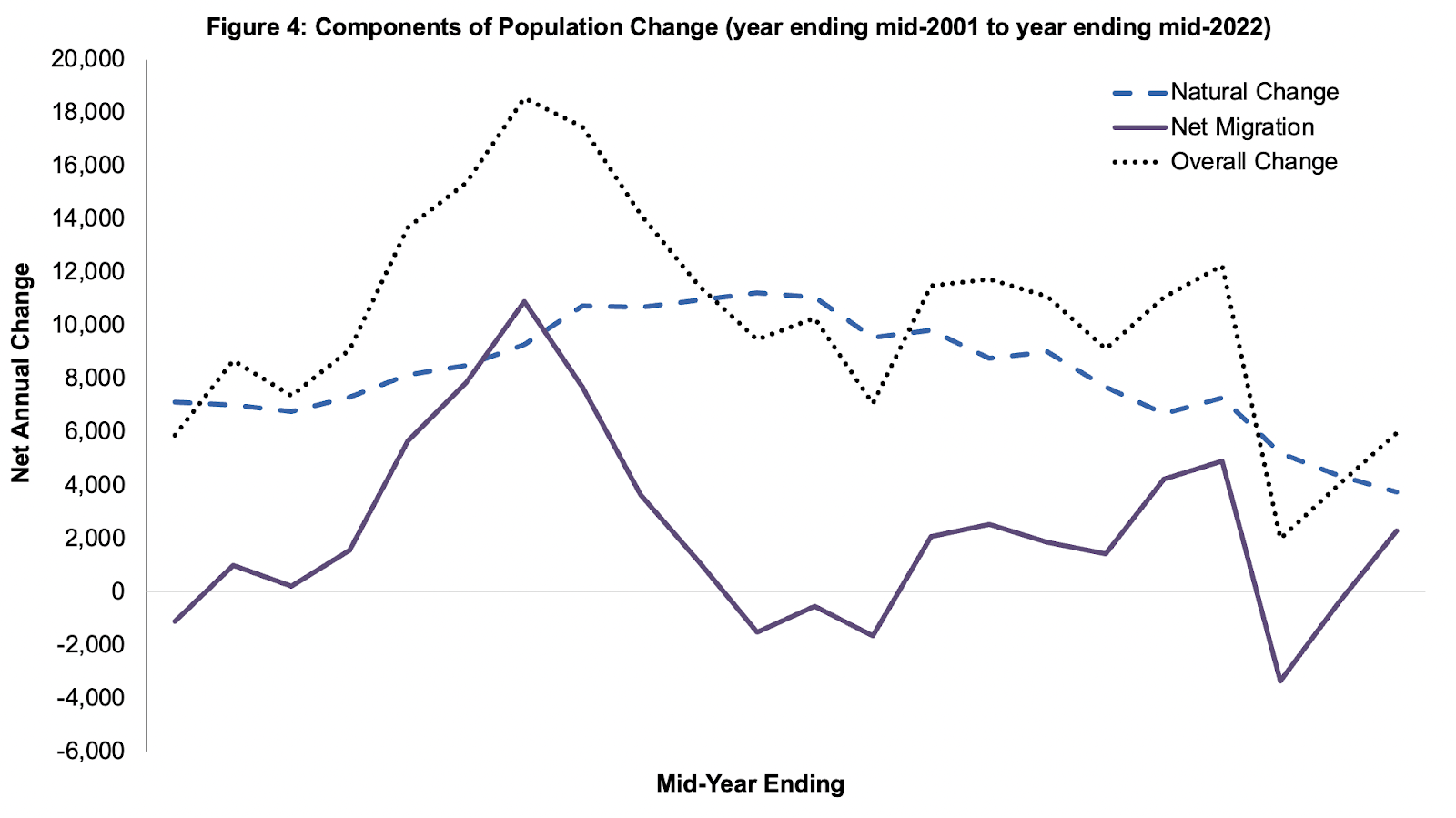 International migration was last negative in 2020 (-1822), and UK migration was negative 2020–2022.