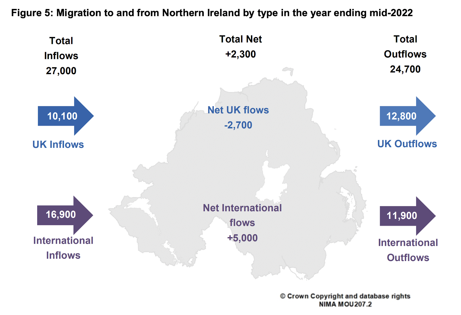 Using statistics from the spreadsheet that underlie the map, 5,020 more people from outside the UK were estimated to have entered Northern Ireland in the year ending mid-2022 than left to move to international locations.